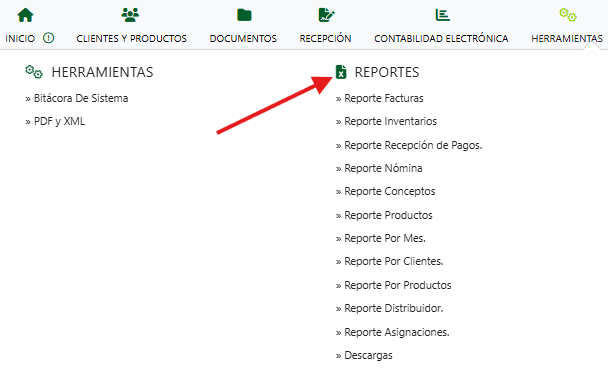 Al dar clic en Herramientas nos mostrará un desplegable en el cual vamos a visualizar el tipo de reportes que podemos generar, por mencionar un ejemplo, reporte facturas y reporte por clientes son algunas de las opciones.